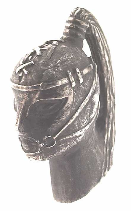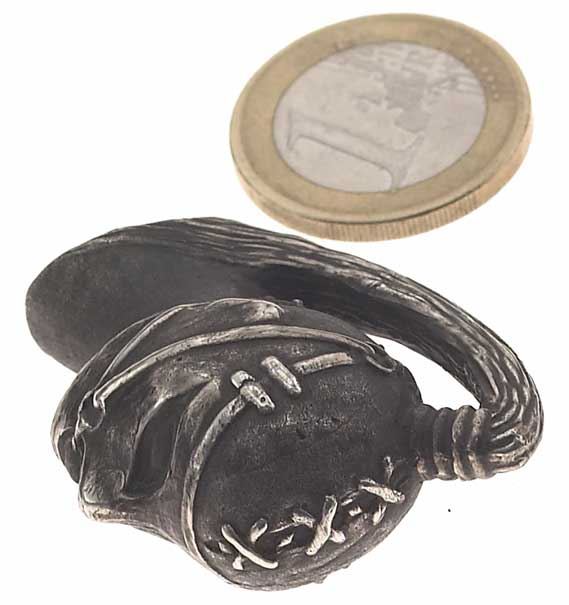 Er ist sehr fein detailreich modelliert und mit einer dunkel oxidierten Oberfläche versehen.