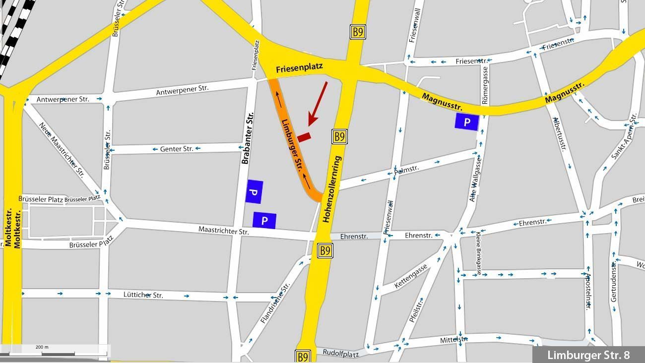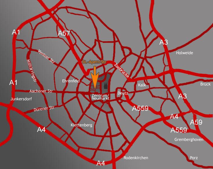 The map above shows an overview of cologne including interchange, the lower map shows the detailed way