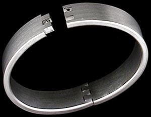 Dieser breite Armreif aus Edelstahl ist sehr päzise und passgenau gefertigt. Er hat ein verschließbares Scharnier mit "Schlüssel". Durch einen kleinen Schraubmechanismus mit einer Inbus-Schraube kann dieser Armreif am Arm des Trägers fest verschlossen werden.