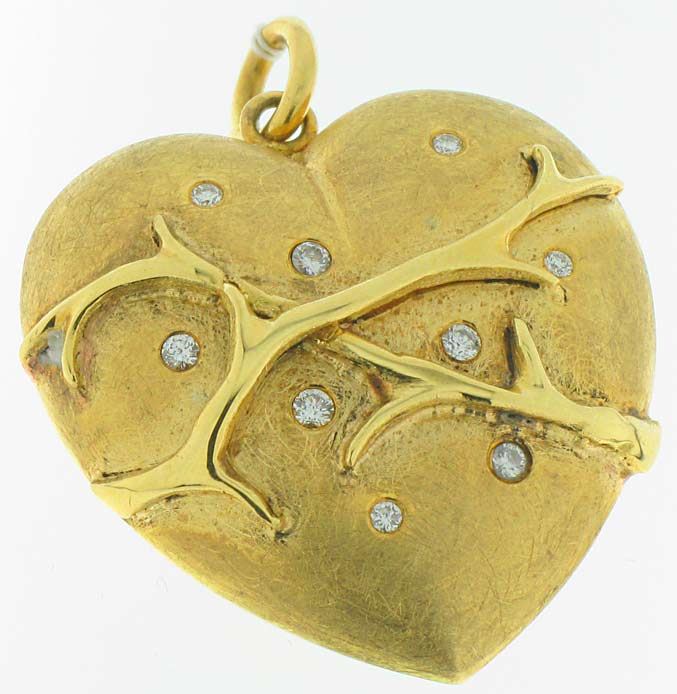 Dieser goldene, in Handarbeit aus 750/000 Gold gefertigte Anhänger zeigt eine Herz umrankt von Dornen. Als zusätzlicher Blickfang sind 9 Brillanten in die Vorderseite eingefasst.