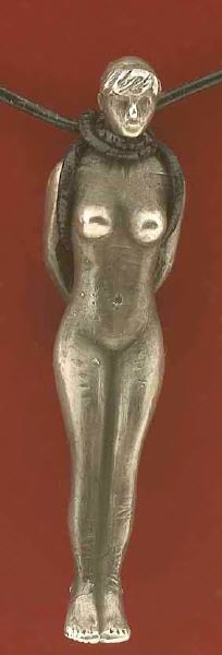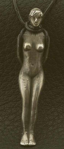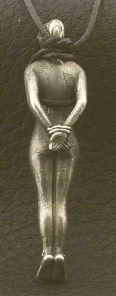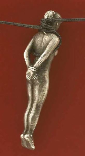 Ein Anhänger, in Form einer "hängenden" Frau, deren Hände auf dem Rücken gefesselt sind .
