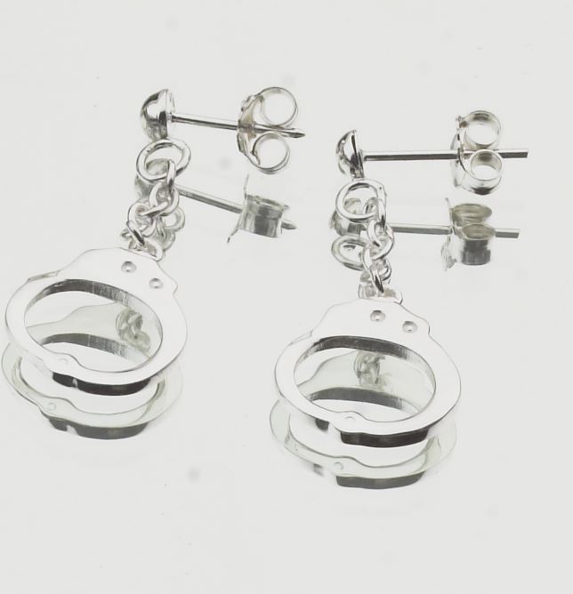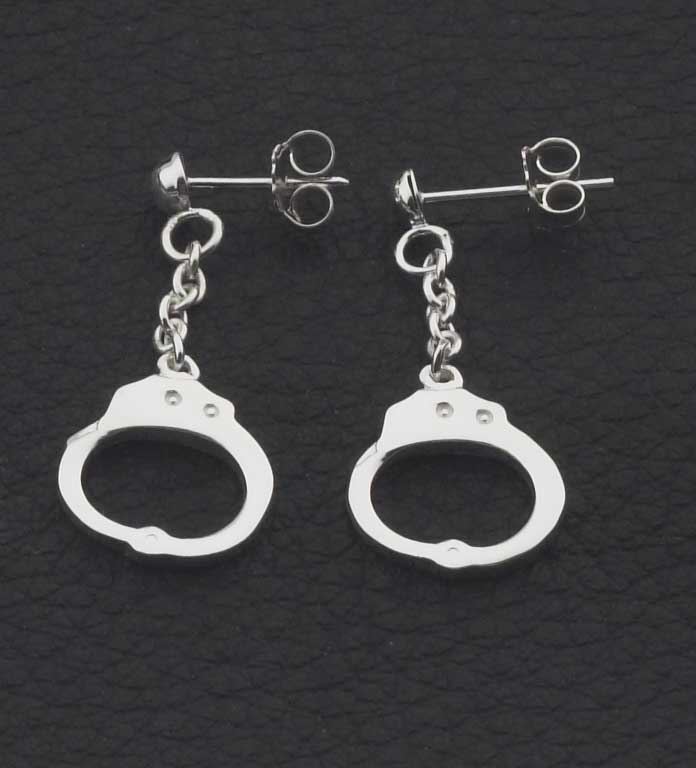 Kleine Handschellen, als Ohrstecker gestaltet und in 925/000 Silber angefertigt.