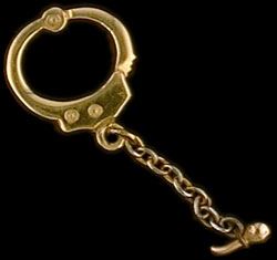 Kleine Handschelle als Ohrstecker gestaltet. Die Handschelle hängt an einer feinen Kette und ist ein dezentes Schmuckstück, das trotzdem eindeutig auf die Vorlieben des Trägers hinweist. Links getragen als Zeichen der Dominanz, rechts als Zeichen der Unterwerfung...