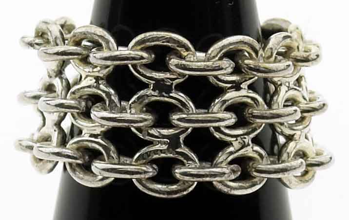 Dieser Ring ist in sehr aufwendiger Handarbeit aus einzelnen miteinander verschweißten Kettengliedern gefertigt. Er ist erhältlich in zweireihig (ca. 7 mm breit), dreireihig (ca. 12 mm breit), vierreihig (ca.16 mm breit).